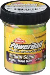 This 50 g floating dough bait combines a proven PowerBait formula with vibrant rainbow colour and banana scent, boosted with extra glitter to trigger strikes from hungry trout.