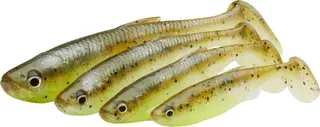 The Savage Gear Fat Minnow T-Tail 9 cm in Chartreuse Pumpkin is a realistic soft bait with kicking paddle-tail action and scented plastic. Ideal for perch, zander and pike on jig heads, with a belly rattle slot for added attraction.