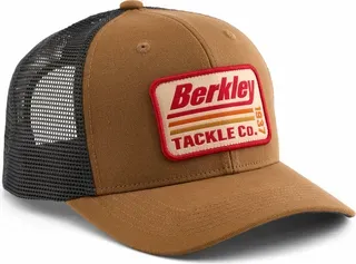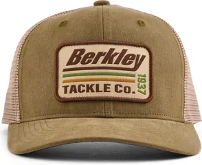 The Berkley Striper Trucker in Olive Khaki pairs retro styling with a recycled-plastic visor and breathable poly-cotton fabric. Mid-crown fit, snapback closure, and embroidered graphics make it a versatile cap for anglers on or off the water.