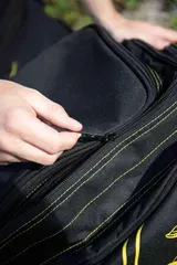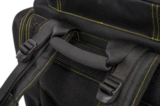 Fully padded back panel and shoulder straps work with the adjustable waist strap to distribute weight evenly, so you can haul heavy terminal tackle, bait, and essentials from car to swim without fatigue. The EVA-supported grab handle offers an alternative lifting point when you need to stow the pack quickly.