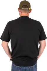 The large distressed Black Cat logo on the chest makes a bold statement. The vintage-style graphic gives the tee a lived-in character that reflects the rugged nature of catfish angling, while the black-on-black design keeps the look understated and versatile.