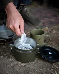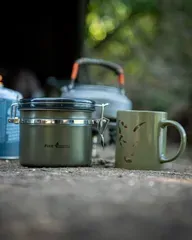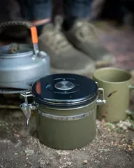 The Fox Cookware Coffee/Tea Khaki Storage 860ml uses stainless steel construction and a built-in keep-fresh valve to protect your coffee and tea from moisture and air, with a calendar wheel to track freshness during long sessions.