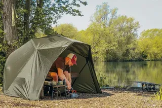 The Fox Easy Brolly 250cm is a fast-setup shelter for mobile anglers, featuring Quick Clips storm poles that stay attached to the frame, an oval design with 120cm headroom, and 8000mm waterproof polyester fabric.