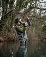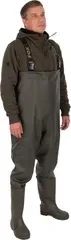 Fox HD Waders in UK 12/EU 46 combine heavy-duty PVC construction with a comfortable polyester-bonded lining, adjustable straps, and a handy chest pocket for reliable, all-day protection on the bank.