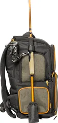 Padded shoulder straps and a ventilated back panel reduce pressure and heat build-up, so the load carries well during active lure fishing. Adjustable straps and loops secure your rods when you need both hands free.
