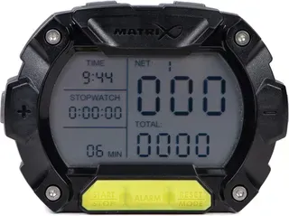 The Matrix Digital Clicker Pro tracks fish counts and weights across up to 12 nets with dual alarms, a large LCD display, and IPX65 weatherproof protection—ideal for organized match and pleasure sessions.
