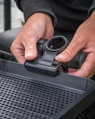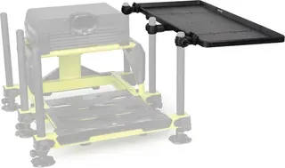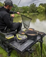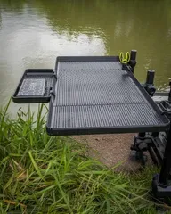 Two movable leg clamps slide along the frame to match different seatbox configurations and grip securely onto 25 mm, 30 mm or 36 mm round legs. The perforated surface drains water and prevents bait build-up, keeping your workspace clean, while full compatibility with Matrix clip-on accessories lets you add bait boxes, tool holders or other modules exactly where you need them.