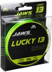 Mikado Jaws Lucky 13 is a 13-strand braid with a FiberCore for high strength and abrasion resistance. This 0.16 mm, 13 kg, fluo green line comes on a 150 m spool, ideal for all-round spinning where thin diameter and dependable power matter.