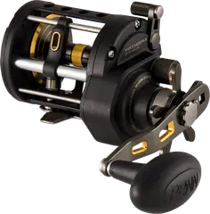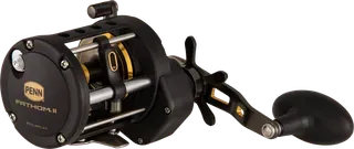The Penn Fathom II Level Wind 20 in left-hand configuration is a full-metal saltwater multiplier reel with a 5.5:1 gear ratio, HT-100 carbon drag up to 13.6 kg, and fast gear access sideplate — built for bottom fishing and live-bait work on cod, pollack, and coalfish.