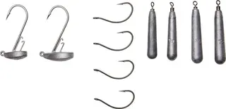 The kit equips you for both jig and dropshot presentations. You get two sizes of stand-up jig heads (3g and 5g, hook size #2) that keep your crayfish upright on the bottom, plus four Super Slide dropshot hooks (size #1) and specialist sinkers (two each of 5g and 7g) for finesse vertical fishing.