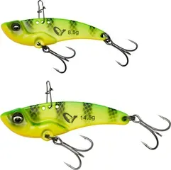A compact blade bait that vibrates and flashes on retrieve while falling away from the centreline on the drop—an irresistible combination for perch, pike, zander, asp, and trout.