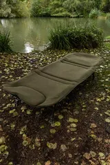 Six extendable legs with swivelling mud feet let you level the bed on uneven bankside ground, adjustable from 33 cm to 45 cm in height. The flat-frame design with padded foam mattress delivers maximum comfort, while the khaki and dark khaki colouration blends naturally into your surroundings. A strap and buckle system allows the bed to pack away compact for transport.